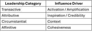 This leadership model considers four categories of leadership from which leaders can draw leadership power – the capacity to influence. I’ve labeled these categories Transactive, Attributive, Circumstantial, and Affinitive: