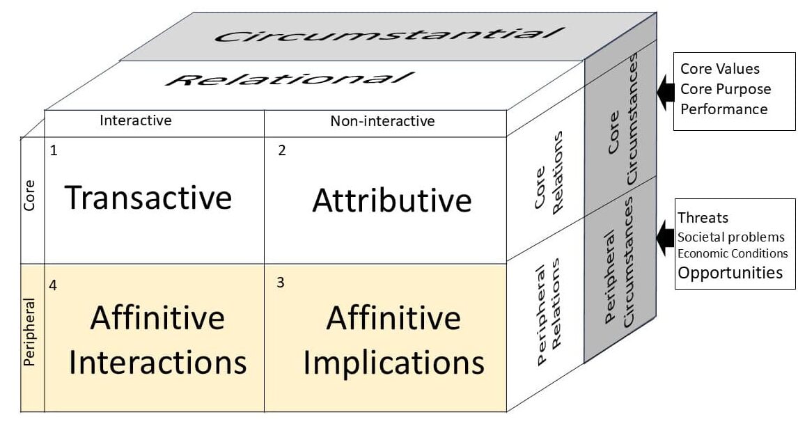Although it sufficiently provides utility and simplifies a complex model, the grid, as presented, is incomplete. Presented along these dimensions, there are two deficiencies. The grid excludes internal company circumstances, considering only external or environmental circumstances. These excluded internal circumstances are non-interactive, but they are, nonetheless, relevant to the company’s goals and objectives. I think of these as ‘facilitated’ circumstances, or perhaps internal conditions. They include items like core purpose, company values, and performance results. The second deficiency is that the Affinitive Leadership category, as presented in the grid, excludes intrinsic identity and relies solely on affinity-based interactions. Despite these deficiencies, this framework is simple and valuable as a basis for developing leadership power, serving as a template for category integration.