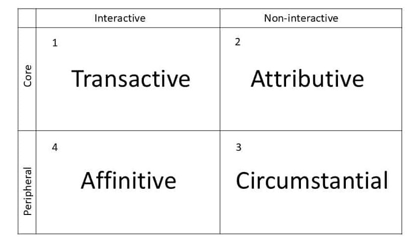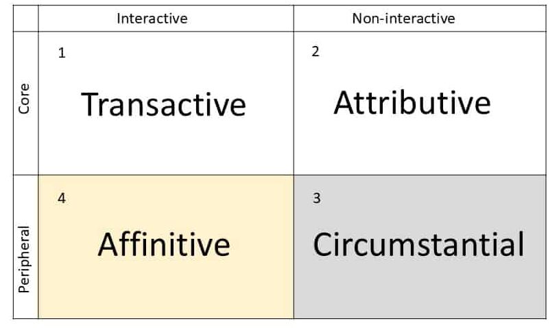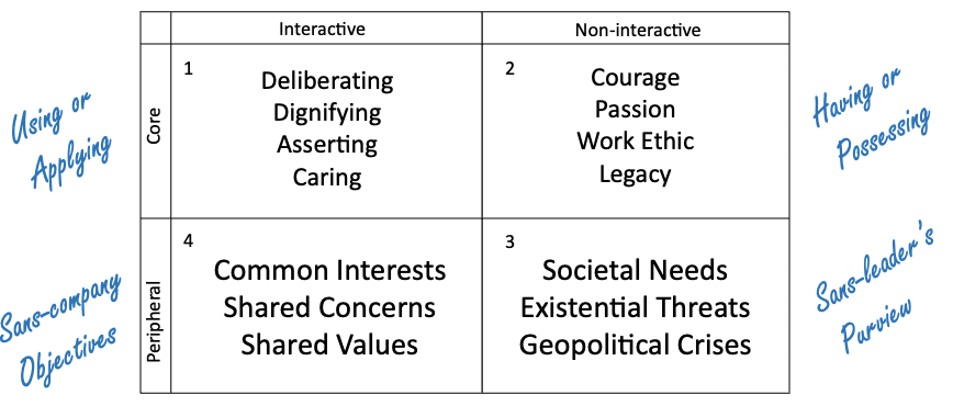 Consider quadrant 1 (Transactive) as ‘using or applying’ and quadrant 2 (Attributive) as ‘having or possessing.’ Quadrant 3 (Circumstantial) is ‘outside of the leader’s purview,’ and quadrant 4 (Affinitive) is ‘unrelated to company objectives.’